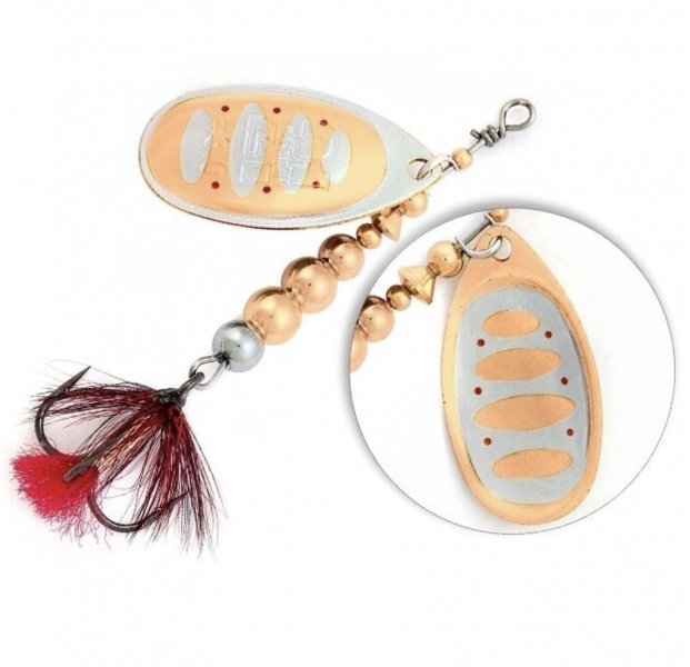 Well-known standard French type of blade was corrected by us to achieve maximum freely rotation of blade under rather big angle to the body. Body consists of components, which number and sizes are fit together in order to achieve zero vibration of body. ZVBS (Zero Vibration Body System) is a fresh view on classic body's components: they were re-designed specially for BCS, and now BCS's body is practically free of parasitic lateral oscillation, the usual problem of many spinners you ever saw. The result is more strikes of trout and salmon. You can fish in streams and cast upstream, downstream and any other direction you want – the quality of BCS's stable action is always high! RPB (Reverse patterns on both sides of blade) – one more non-standard feature of BCS: it is well-visible from any side and looks the same independently on point of view. Color of body's components and trebles' (Owner ST-36BC) rigs correspondent to RPB. As a result BCS look as organic whole, and careful predator does not grow suspicious at BCS during its retrieving.